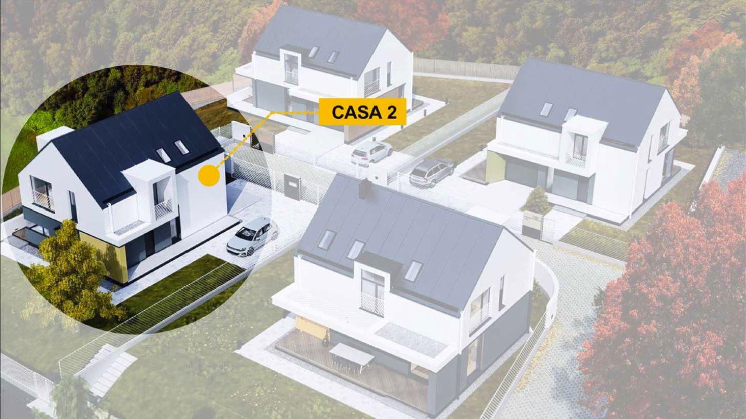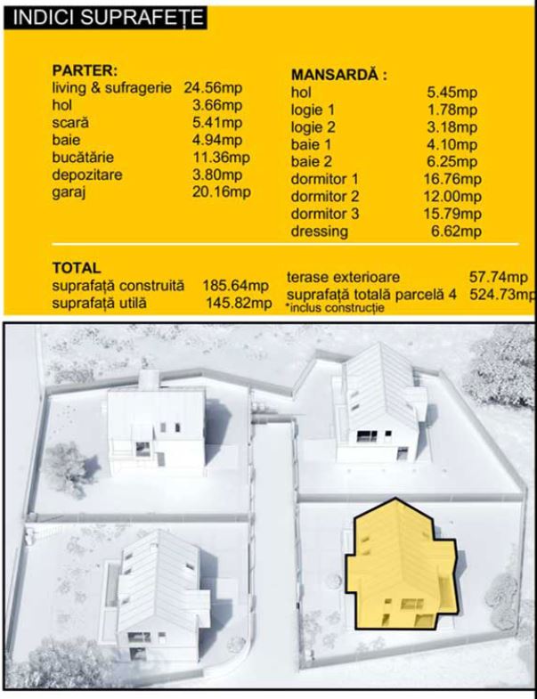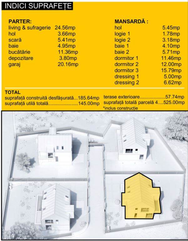 Proiectul e alcătuit din patru case individuale, în care arhitectura minimalistă se îmbină cu accente contemporane. Situat in Baia Mare, într-o locație pitorească, în liniște și în natură, cu o priveliște de excepție, dar totuși aproape de centrul orașului, casa e ideală pentru familii, fiind spațioasă și frumos compartimentată.