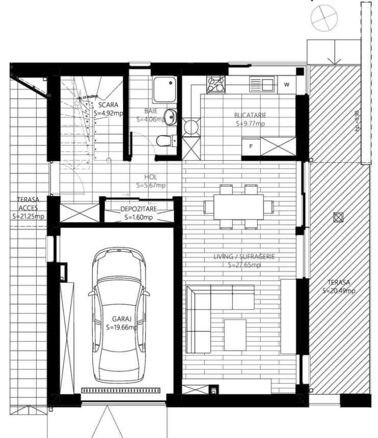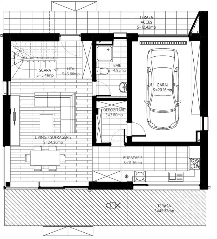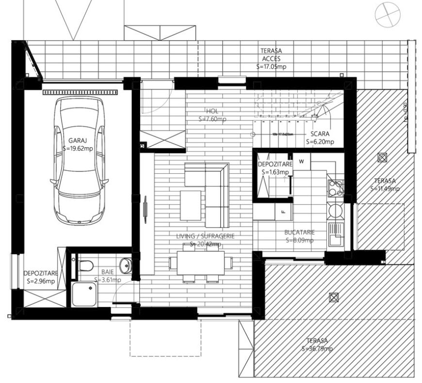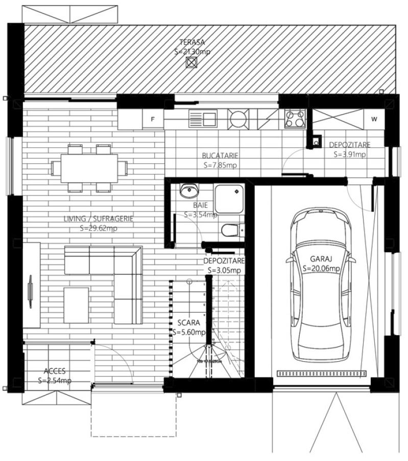 La parter este organizată zona socială și de activitate a casei, fiind compusă dintr-o camera de zi, 1 bucătărie, 1 cămară, 1 spațiu pentru centrala termică, 1 baie, 1 cameră (ce poate fi amenajată fie ca dormitor, fie ca birou), 1 hol și o terasă exterioară.