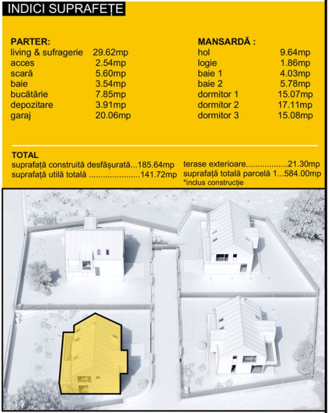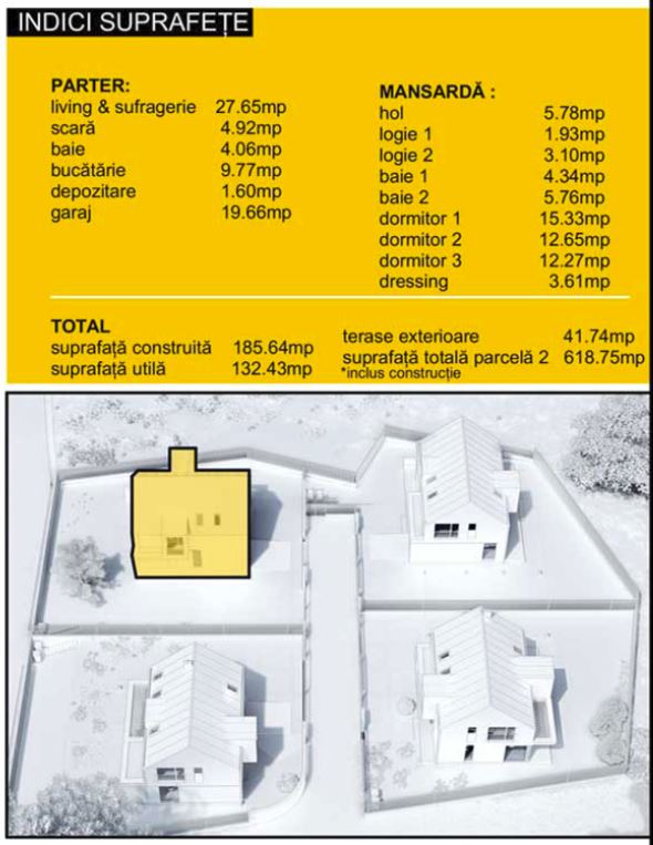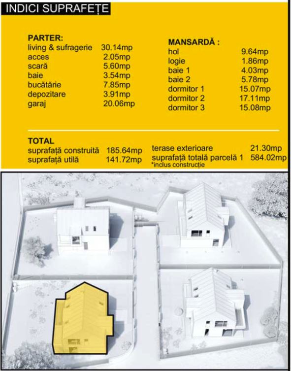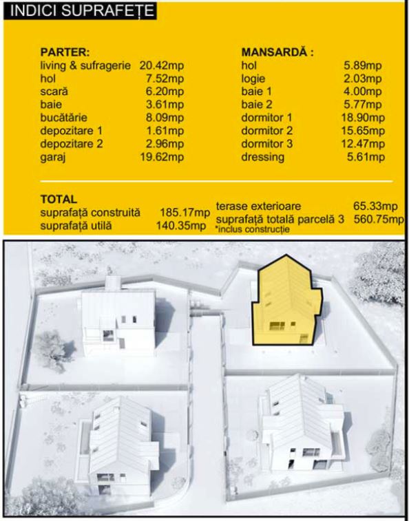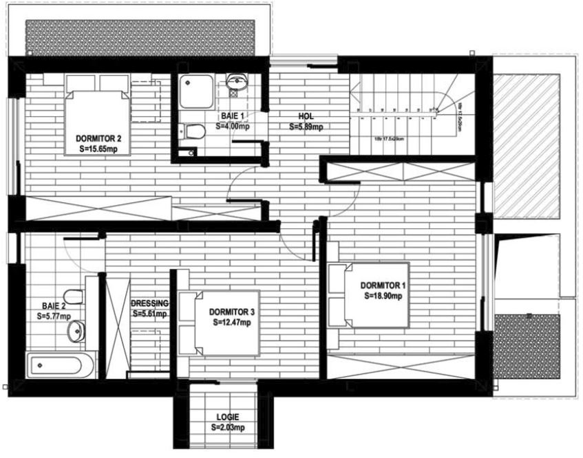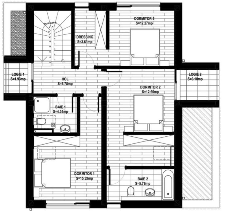 La etaj (mansarda) este zona de intimitate și de odihnă, fiind compusă din 3 dormitoare, 2 băi, 1 hol și 1 terasă exterioară. Unul din dormitoare este matrimonial, dispune de baie proprie și dressing încorporat în cameră). Așadar, compartimentarea casei este gândită pe principii ce conferă confort, funcționalitate și intimitate.