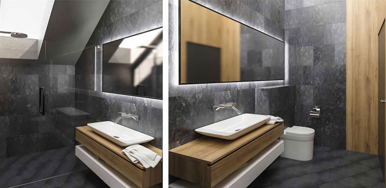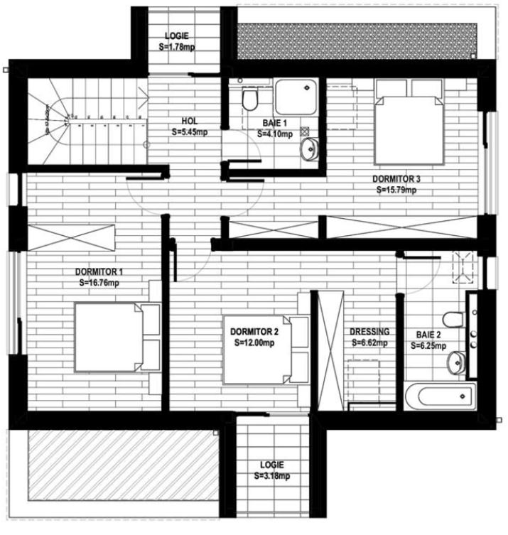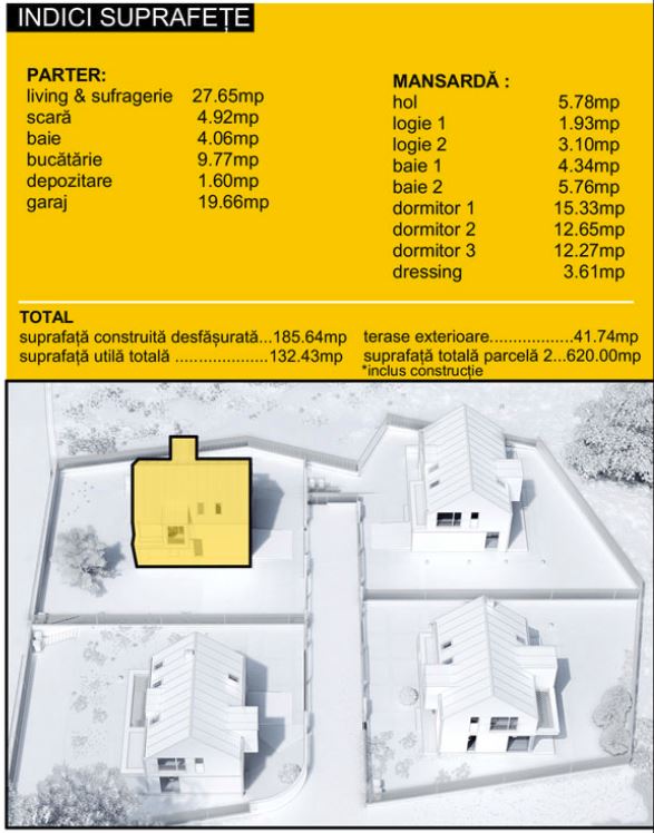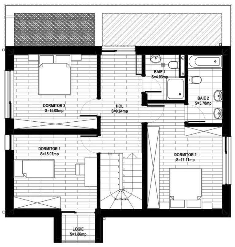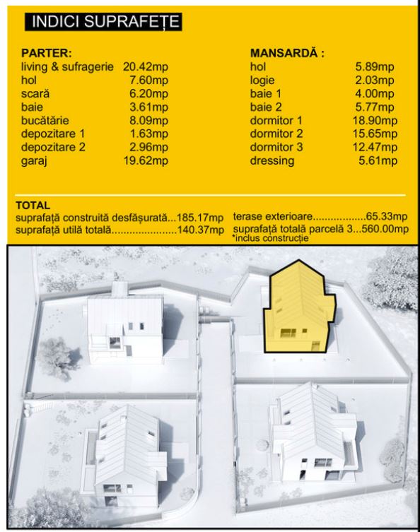 La etaj (mansarda) este zona de intimitate și de odihnă, fiind compusă din 3 dormitoare, 2 băi, 1 hol și 1 terasă exterioară. Unul din dormitoare este matrimonial, dispune de baie proprie și dressing încorporat în cameră). Așadar, compartimentarea casei este gândită pe principii ce conferă confort, funcționalitate și intimitate.